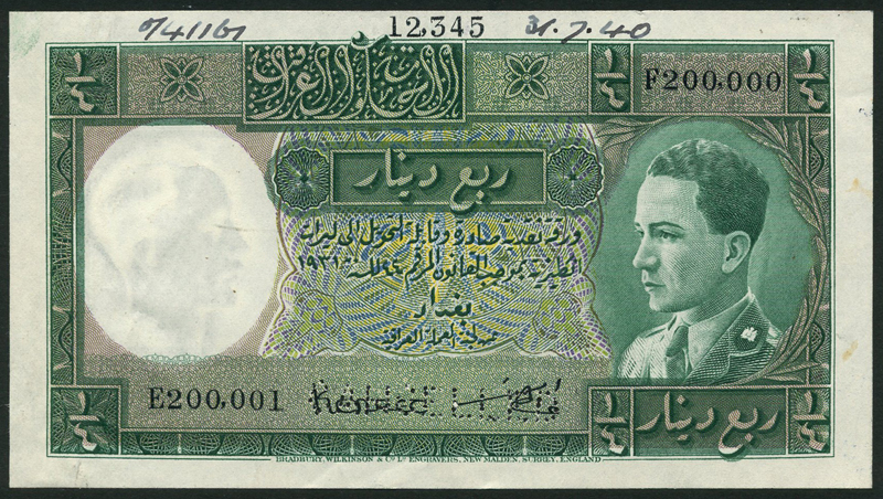 Government of Iraq, specimen 1/4 dinar, law of 1931, serial number E 200001-F 200000, green and pale yellow and lilac, King Ghazi at right, Kennet and Amin signatures, reverse green and white
