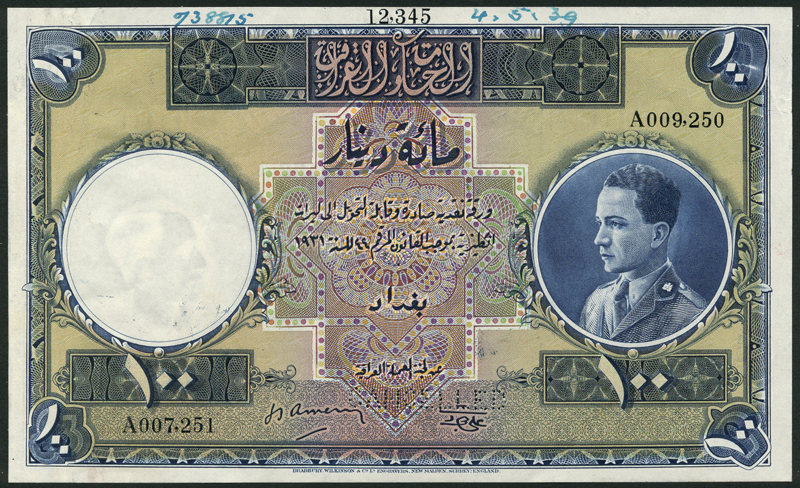 Government of Iraq, specimen 100 dinars, law of 1931 (1936), serial number A 007251-A 009250, blue and lilac and white, King Ghazi at right, two printed signatures below, value at each corner, reverse blue and white