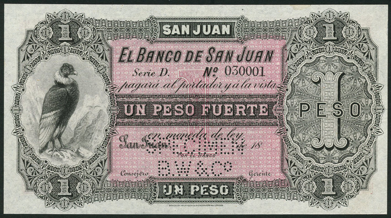 El Banco de San Juan, Argentina, specimen 1 peso, ND (ca 1876), serial number 006001, serie D, black and pink, condor at left, value at right, value at each corner, red and green, head of Liberty at left and right