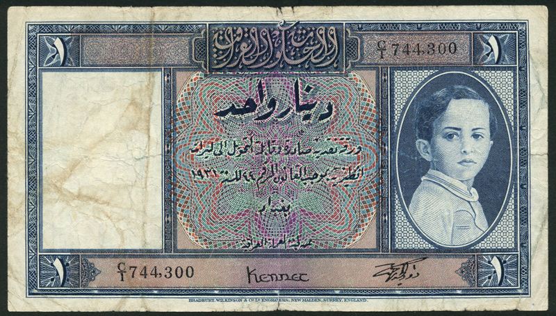 Government of Iraq, 1/4 dinar and1 dinar, both law of 1931 (1942), serial numbers J605,289 and C/1 744,300, green and blue respectively on multicolour underprint, King Faisal II as child at right