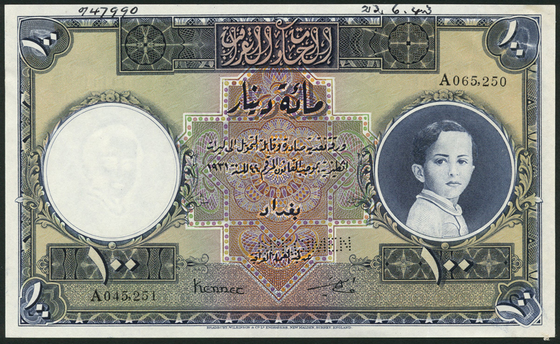 Government of Iraq, specimen 100 dinars, law of 1931 (1943), serial number A043251 - A065250, blue and multicoloured, King Faisal II as a child at right, Kennet and Amin signatures, reverse blue and white, value