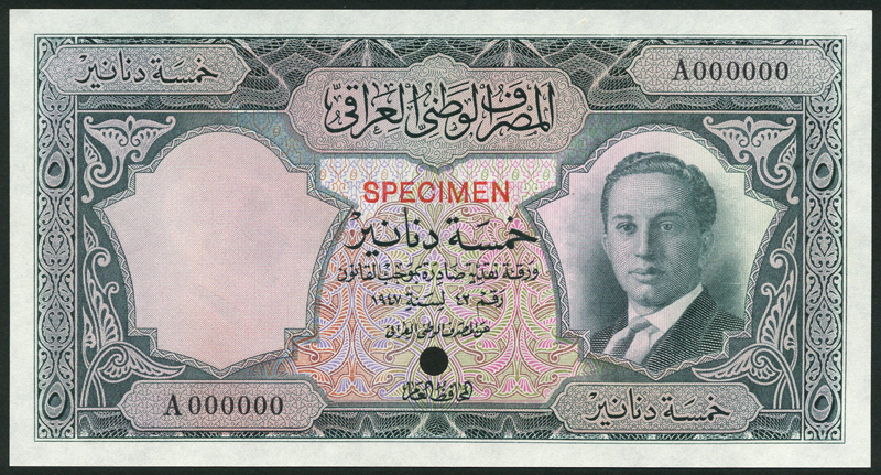 National Bank of Iraq, colour trial 5 dinars, law of 1947, serial number A000000, blue, green and multicolour, King Faisal II as an adolescent at right, reverse olive green, Hammurabi receiving the laws at centre, value at left