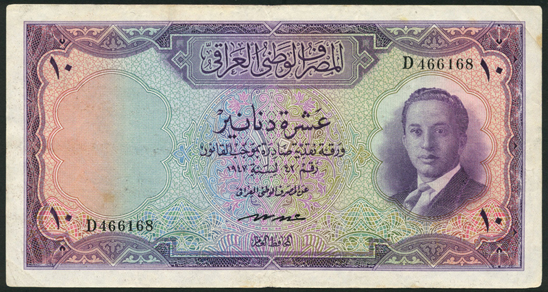 National Bank of Iraq, 10 dinars, Law of 1947 (1955), serial number D466168, purple on multicolour underprint, King Faisal II at right