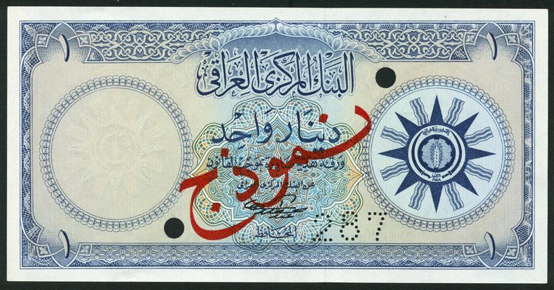 Central Bank of Iraq, specimen 1 dinar, ND (1959), blue on multicoloured underprint, Republic arms at right, value at each corner, reverse the Harp of Ur