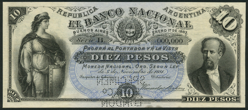 El Banco Nacional, Argentina, specimen 10 pesos, 1 January 1881, serial number B 000000, black and white, a pale blue guilloche at centre, maiden at left, arms top centre, President Roca at right, reverse green, value at left and right