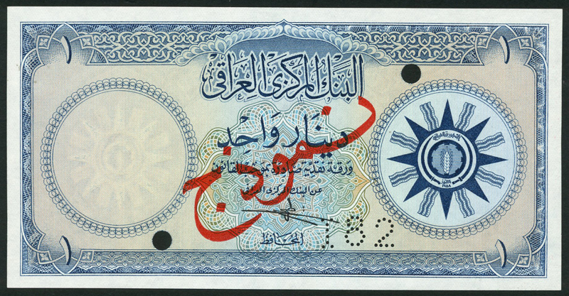 Central Bank of Iraq, specimen 1 dinar, 1959, no serial numbers, blue on multicolour underprint, Republic arms at right, value at each corner, reverse the Harp of Ur at centre