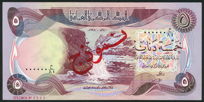 Central Bank of Iraq, 5 dinars, 1980/AH1400, zero serial numbers, brown-violet and dark blue on multicolour underprint, Gali-Ali Beg waterfall at centre, value at each corner, reverse Al-Ukhether Castle