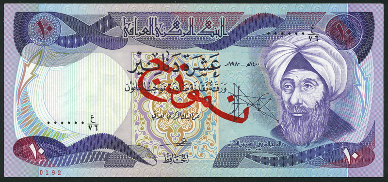 Central Bank of Iraq, 10 dinars, 1980/AH1400, zero serial numbers, purple on multicolour underprint, scientist at right, value at each corner, reverse minaret and trees