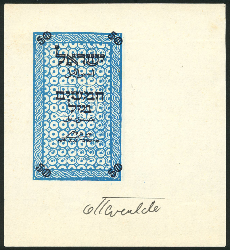 Anglo-Palestine Bank Limited, a proof uniface 50 mils, 1948, no serial numbers, black text on blue and white on large format paper, value at each corner, Kaplan signature,