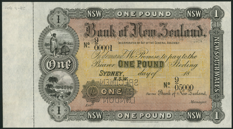 Bank of New Zealand, specimen £1, Sydney, N.S.W., 18- (1885), serial number 9/00001-9/05000, black, mauve and pale orange, Maoris and landscape at left, NSW in border above and below, reverse brown, value at centre