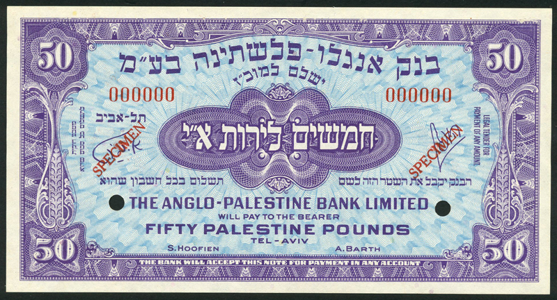 Anglo-Palestine Bank Limited, a specimen set of the 1948 issue, comprising 500 mils, grey, 1 pound, dark blue, 5 pounds, brown, 10 pounds, red, and 50 pounds, purple, all with red zero serial numbers, ornate borders and vignettes at centre, value at each corner, reverse similar design in muted colours