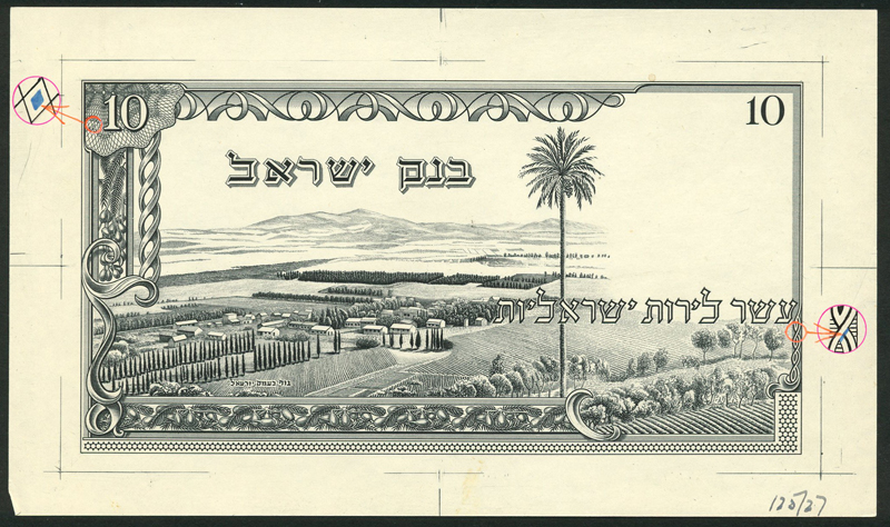 Bank of Israel, obverse and reverse black and white die proofs for a 10 lirot, 1955 black and white, Plain of Jezreel and palm tree, value at top corners, reverse values, each with hand drawn printers secret marks in colour