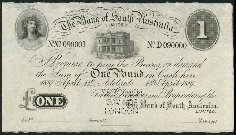 The Bank of South Australia Limited, specimen £1, Melbourne, 1 April 1887, serial number C090001-D 090000, black and white, bank building top centre, head of a maiden top left, value top right, reverse brown, value at centre