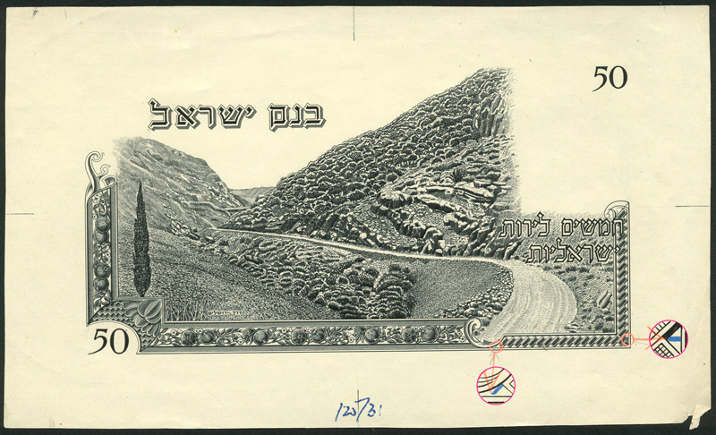 Bank of Israel, obverse and reverse black and white die proofs for a 50 lirot, 1955, black and white, landscape with road and mountains, value at top right and low left, reverse values, each with hand drawn printers secret marks in colour