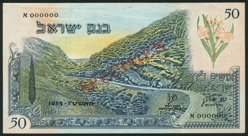 Bank of Israel, specimen 500 pruta, red, specimen 1 lira, blue, specimen 5 lirot, purple-brown, specimen 10 lirot, blue-grey and specimen 50 lirot, blue and multicoloured, all 1955