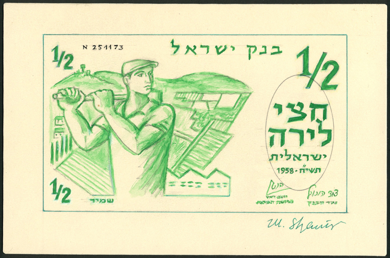 Bank of Israel ´Ideal figures´ series, a hand executed essay on board for a 1/2 lira, 1958, serial number 297420, green and white, allegorical male figure at left, background of cultivated fields almost identical to the adopted design with ´female soldier´, signature of Nebenzahl low right