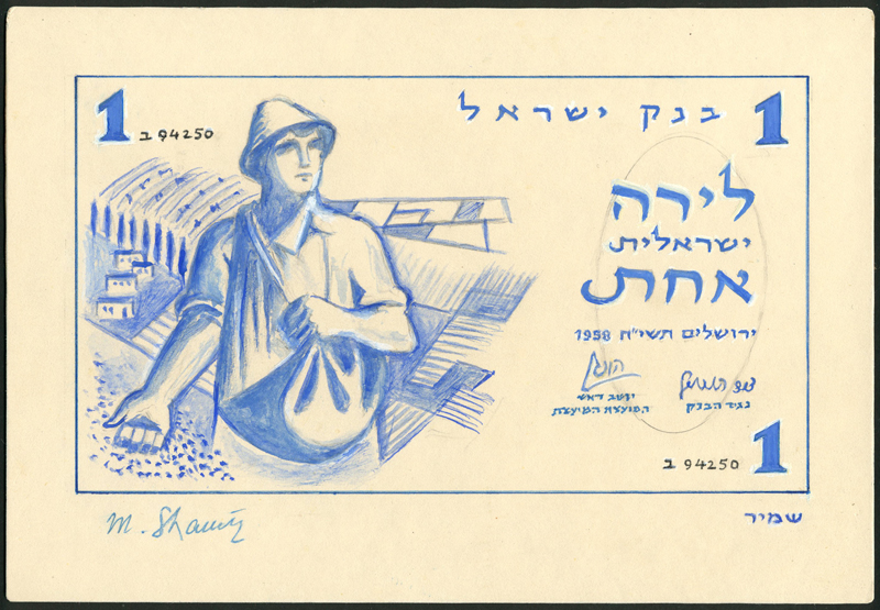 Bank of Israel ´Ideal figures´ series, a hand executed essay on board for a 1/2 lira, 1958, serial number 297420, blue and white, farmer sowing seed at left, background of cultivated fields as on the previous lot and on the final approved design, signature of Nebenzahl low right