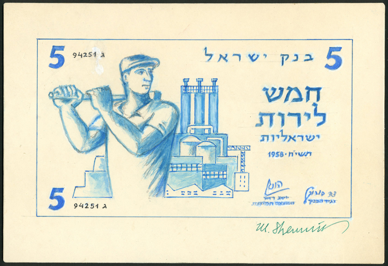 Bank of Israel ´Ideal figures´ series, a hand executed essay on board for a 5 lira, 1958, serial number 94251, blue and white, worker at left, factoty in background, signature of Nebenzahl low right
