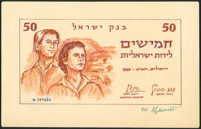 Bank of Israel ´Ideal figures´ series, a hand executed essay on board for a 50 lira, 1959, serial number 297420, red-brown and white, an allegorical couple representing ´the return of the exiles´, rural landscape in background, signature of Nebenzahl low right