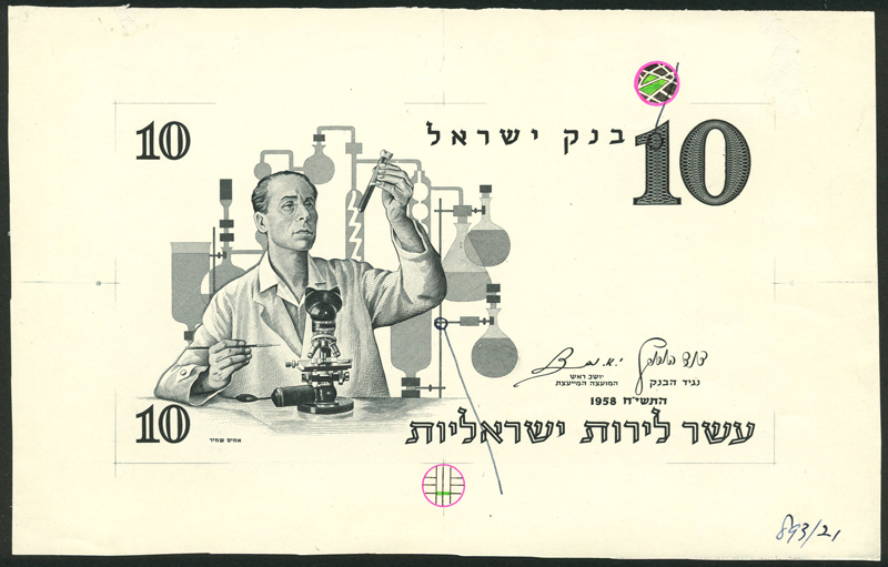Bank of Israel, obverse and reverse die proof for a 10 lirot, 1958, black and white, scientist with microscope and test tube, reverse Dead Sea Scrolls, both sides with printers secret marks hand drawn in colour