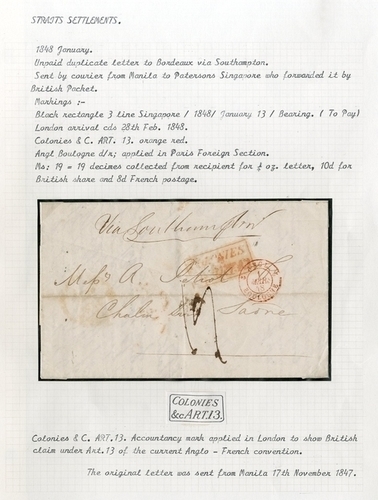 Colonies/&c Art.13.: 1848 (17 Nov.) duplicate entire from Manila to Bordeaux "Via Southampton" bearing a fair strike of the boxed "Colonies/&c ART.13." in red, "angl/boulogne" transit (1.3) and manuscript "19" rate mark, the reverse with boxed "singapore/1848 January 13/Bearing", London transit (28.2) and the arrival c.d.s. (3.3); horizontal filing crease and some light soiling. Photo