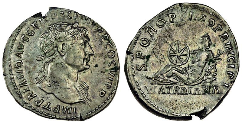 Trajan (98-117), Denarius, Rome, 113, laureate head right, drapery on far shoulder, rev. via traiana, female reclining left, holding wheel and branch (RIC 266; BMC 487; C. 648), toned, good very fine