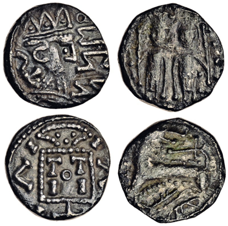 Anglo-Saxon, secondary series, c.710-40, Sceattas (2), 1.14g, series R1, radiate bust right, epa runic letters before, rev. standard (Abr. sub group 3 R100; N 159; S.813), very fine; 1.10g, series N type 41b, two standing figures each holding a staff, rev. back biting animal left (Abr.300. N.99; S.806), uncleaned field find, good fine (2)