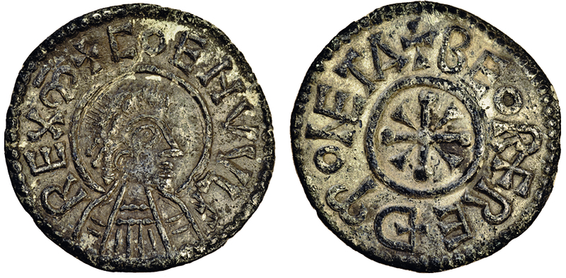 Mercia, Coenwulf (796-821), Penny, 1.29g, cross and wedges type, c.805-10, Canterbury, Beornferth, diademed bust right, legend commencing at 12 o'clock, +coenvlf-rex m, uncial m, contraction bar above, rev. +beornfreÐ moneta, uncial letter m, wedges in angles (Naismith C23 - this reverse die not noted; N.344; S.915), creased, lightly porous surfaces, slightly double struck on obverse, very fine, rare