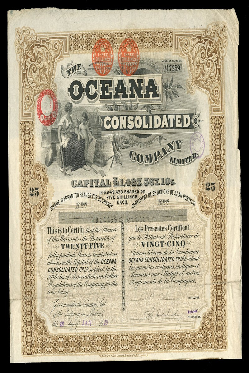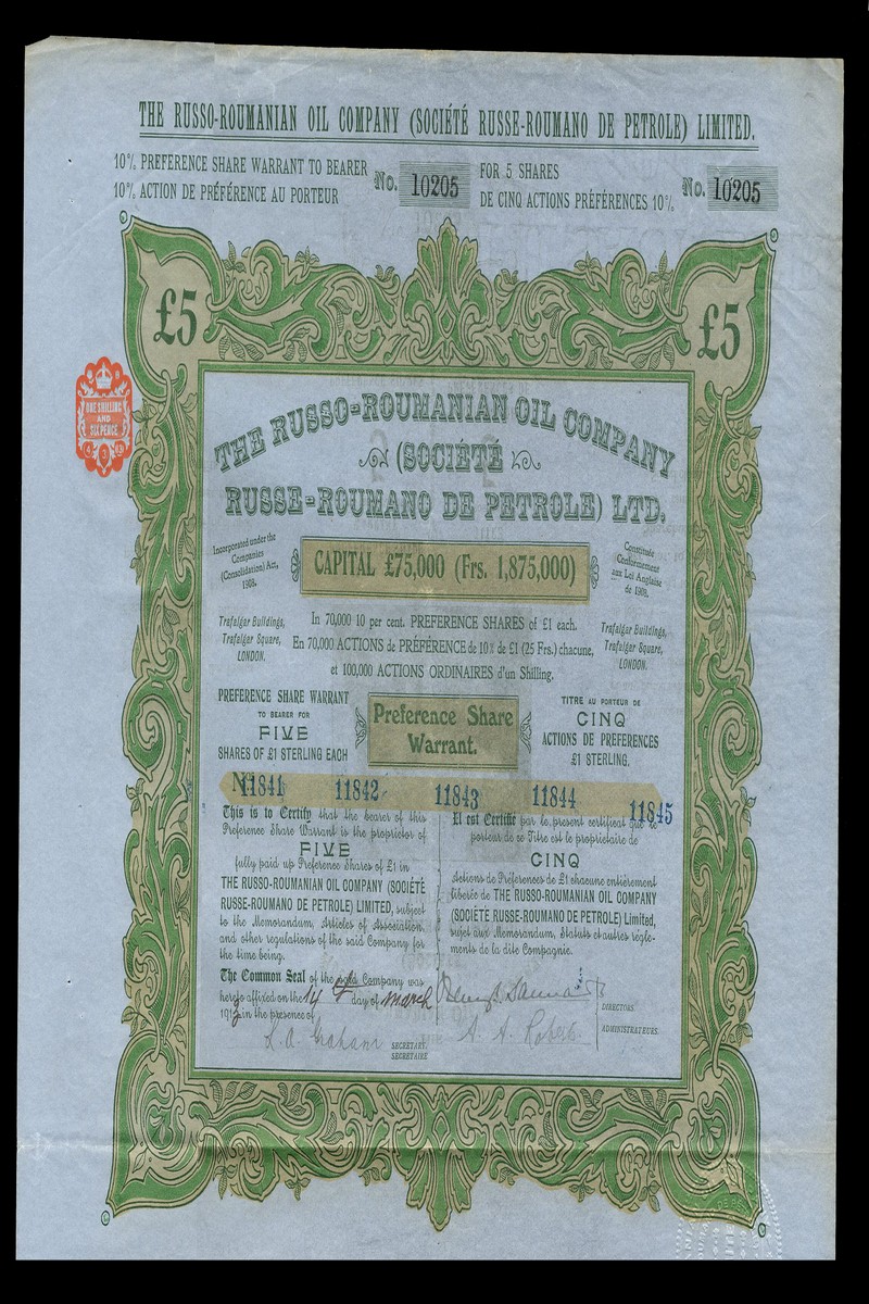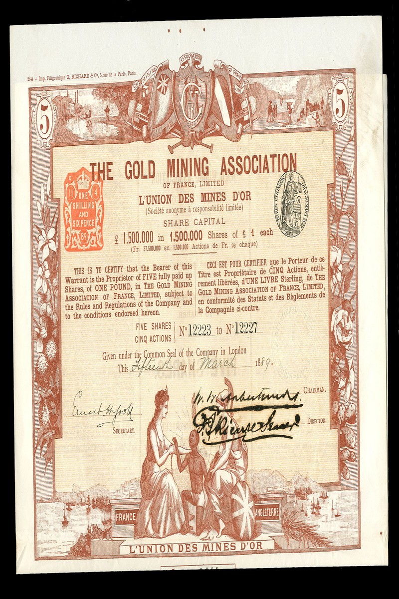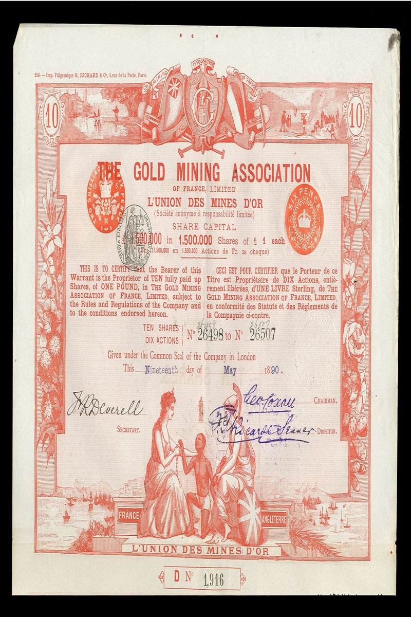 Gold Mining Association of France Ltd., a group of 3 bearer warrants for 1, 5 and 10 shares of £1 each, 1889, attractive borders with mining scenes, green, brown and red respectively, with coupons; together with other British registered companies (10), including Russo-Roumanian Oil Co. (Russe-Roumano de Petrole) Ltd., preference share warrants, 1913 (2 examples); Paccha and Jazpampa Nitrate Co. Ltd., 10 shares, 1895, very attractive piece printed by Waterlow & Sons, and I X L Gold & Silver Mining Co. Ltd., £1 shares, 1874, generally very fine and better. (13)