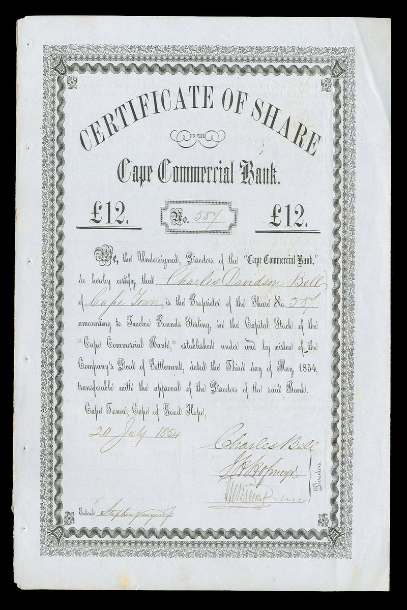 (x) Cape Commercial Bank, £12 share numbered 587, Cape Town 1854, black on blue paper, extremely fine.