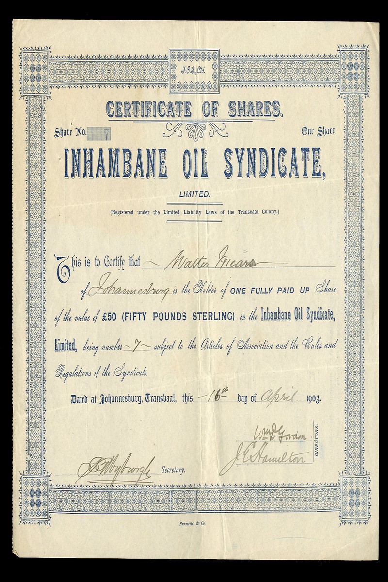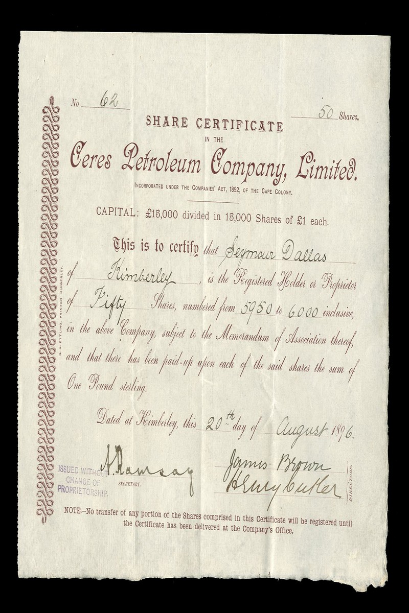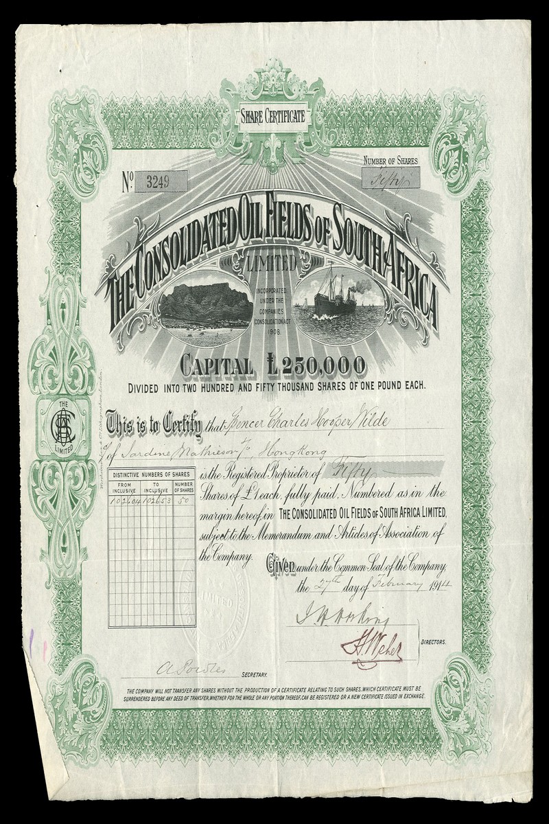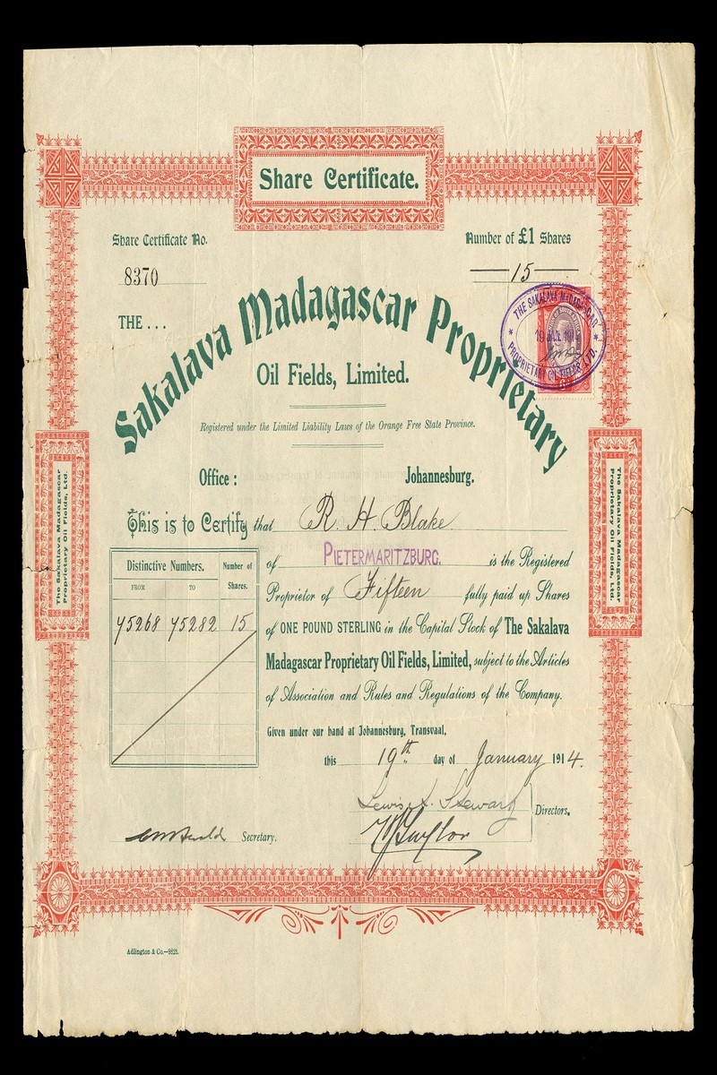 (x) Ceres Petroleum Company Ltd., £1 shares, Kimberley 189[6], maroon, together with 3 more shares in Southern African oil companies, including, Consolidated Oil Fields of South Africa Ltd.,vignette of Table Mountain and cargo ship, 191[4], green, Inhambane Oil Syndicate Ltd., £50 share, Johannesburg 1903, blue border, and Sakalava Madagascar Proprietary Oil Fields Ltd., £1 shares, Johannesburg,19[14], red and green with affixed revenue stamp, generally very fine (4)