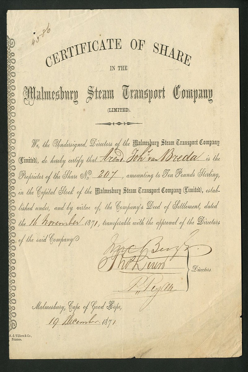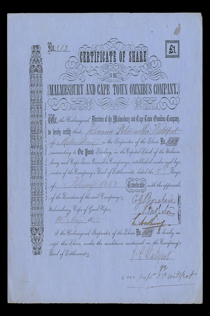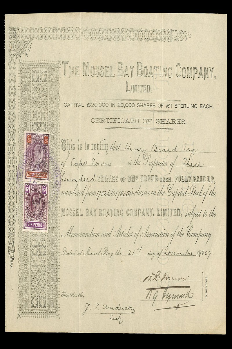 (x) Forbes Motor Transport (Propy) Ltd., 19[28] black with 5 revenue stamps, issued to and signed by Arthur Forbes, Malmesbury Steam Transport Co., £10 share no. 207 issued Malmesbury 187[1], black, Malmesbury and Cape Town Omnibus Company, £1 share no. 312, Malmesbury 18[58], blue, and Mossel Bay Boating Company Ltd., 1[907], revenue stamps, black, very fine (4)