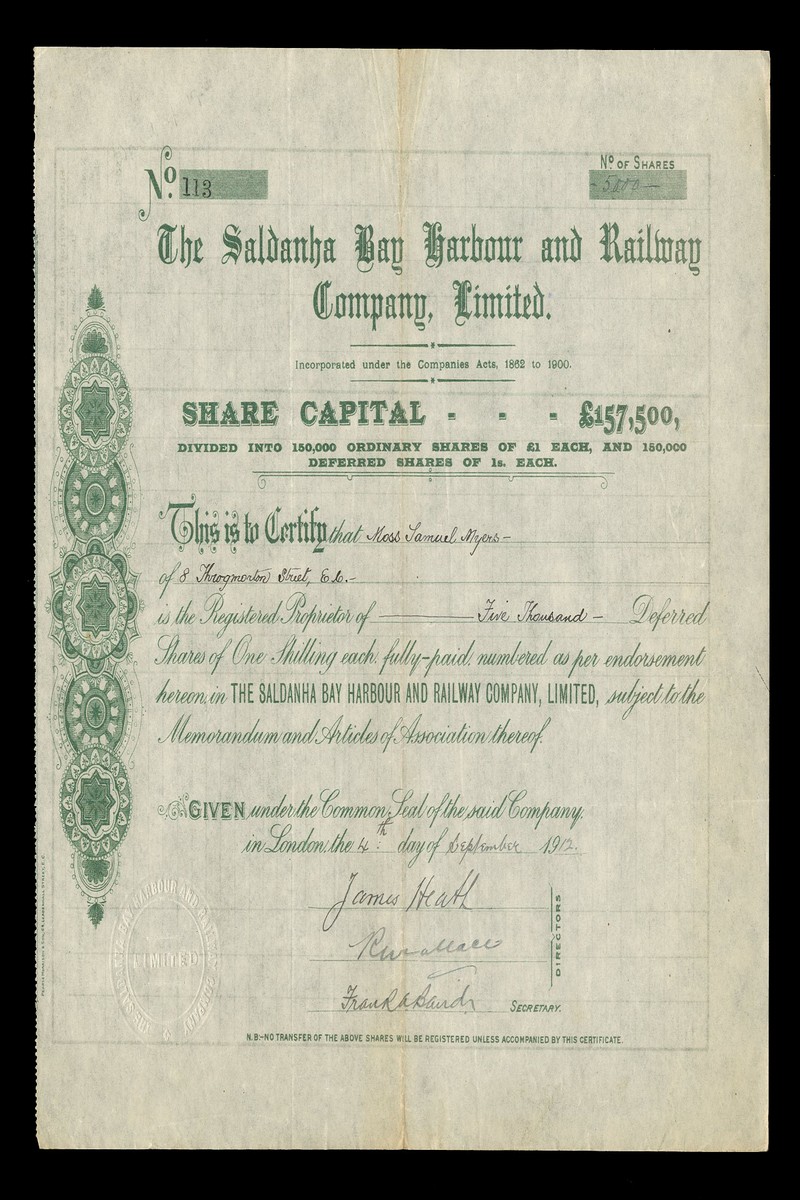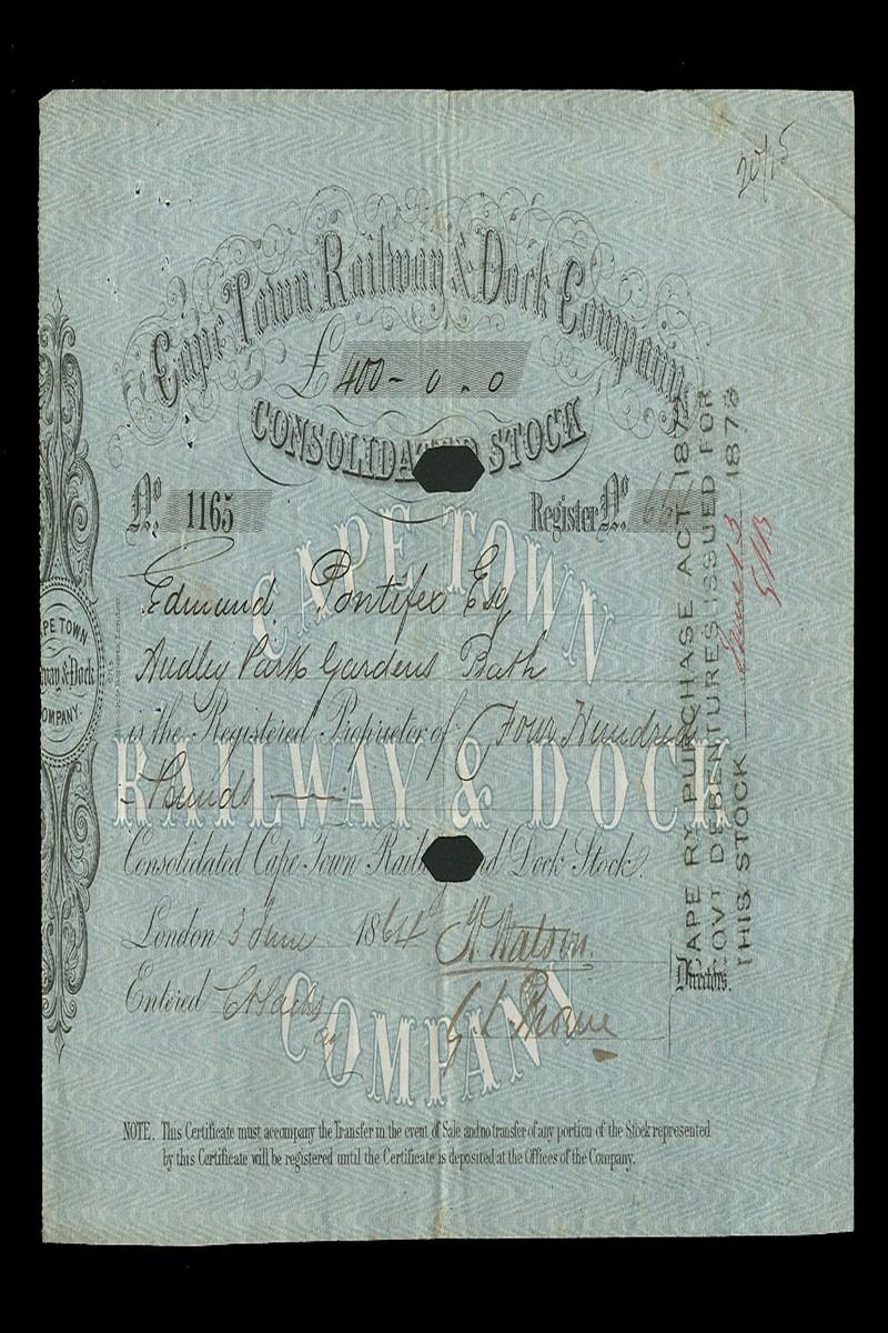 (x) Northern Railway of the South African Republic, bearer share numbered 10679, [1895], decorative border, red/black, overprinted capital, and 2 further shares related to transport, including , Cape Town Railway & Dock Company, £400 consolidated stock, hole cancelled, London 18[64], blue, and Saldanha Bay Harbour and Railway Company Ltd., certificate for 5000 deferred shares of one shilling each, London 19[12], green some creasing otherwise very fine (4)