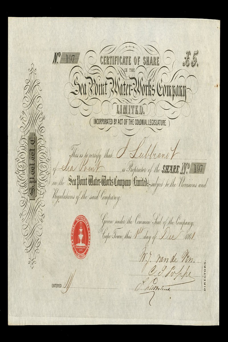 (x) Sea Point Waterworks Company Ltd pair of share certificates issued in Cape Town; £5 share no. 197, 186[1], black with red company seal and £5 share no. 492, 18[73] overprinted duplicate original forfeited, black extremely fine and rare