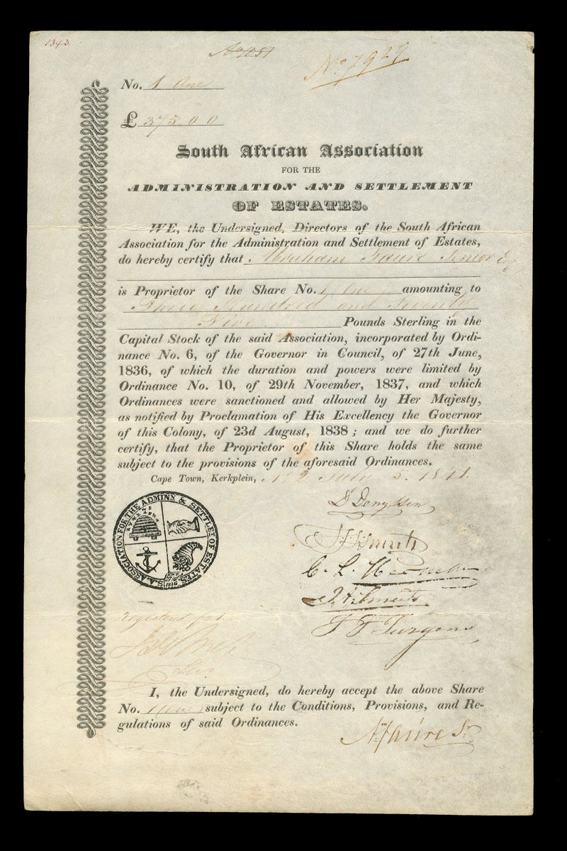 (x) South African Association for the Administration and Settlements of Estates, certificate for one share of £375, Cape Town, Kerkplein [1841], No.1, black printing, on vellum, good very fine and rare