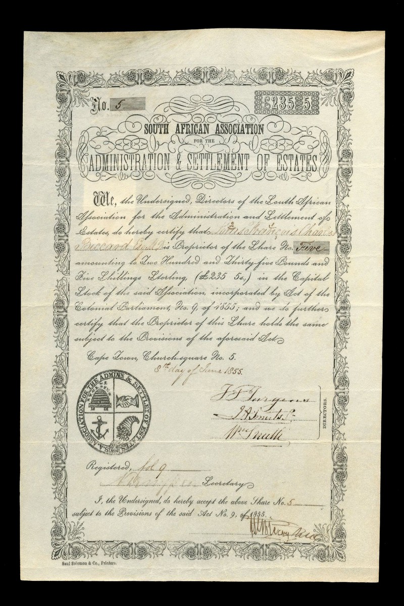 (x) South African Association for the Administration & Settlements of Estates, £235 5s share, Cape Town, Churchsquare [1855], No.5, ornate border, black printing, on vellum, good very fine and rare.