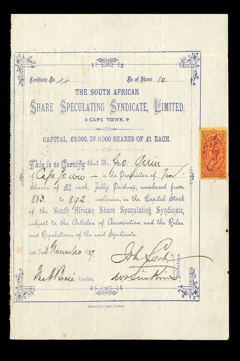 (x) Sout African Share Speculating Syndicate Ltd., £1 shares, Cape Town 18[89], blue with affixed revenue stamp, good very fine