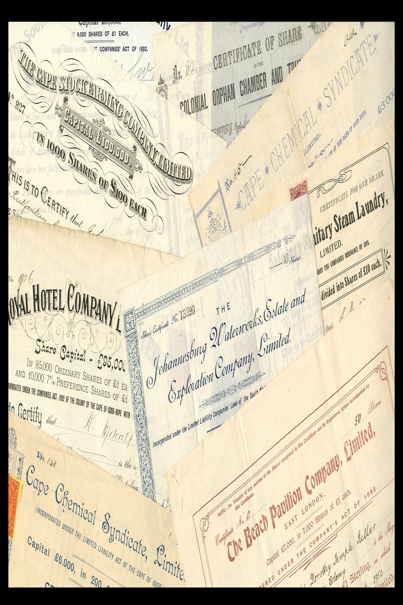 (x) Interesting Group of 19th and 20th Century South African Commercial Companies, comprising Beach Pavilion Company, 1903; Cape Chemical Syndicate Ltd., (2 types) 1896 & 1898; Cape Stockfarming Company Ltd., 1883; Colonial Orphan Chamber and Trust Company, 1885; Johannesburg Waterworks Estate & Exploration Co., 1895; Royal Hotel Company, 1903; Salisbury Sanitary Steam Laundry Ltd., 1910; Southern Cross Tobacco Company, 1908; Consolidated Whaling and Deep Sea Fishing Company of South Africa Ltd., 1914; together with a batch of 17 certificates including Cape Town & Suburban Electric Lighting Syndicate Ltd.,1897, good very fine. (27)