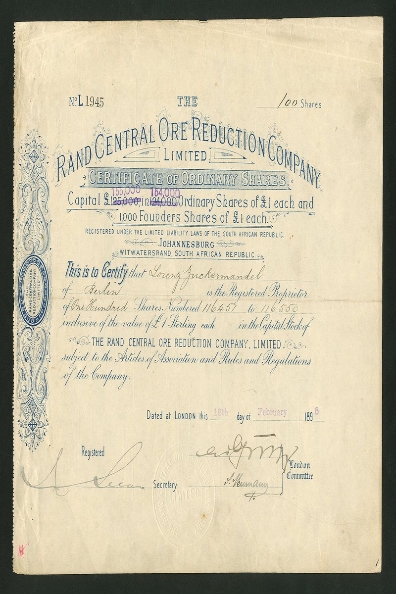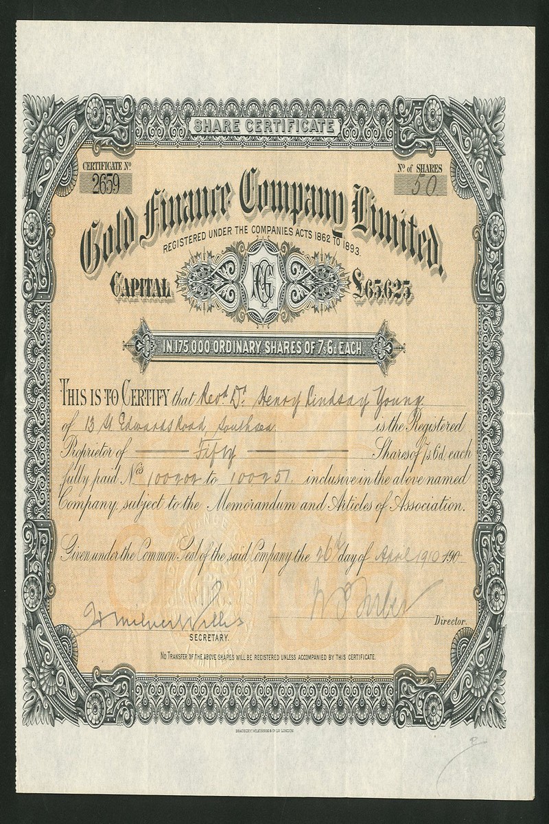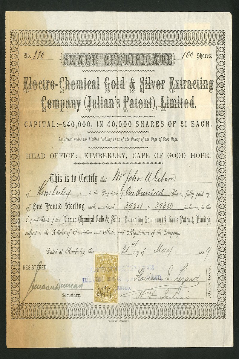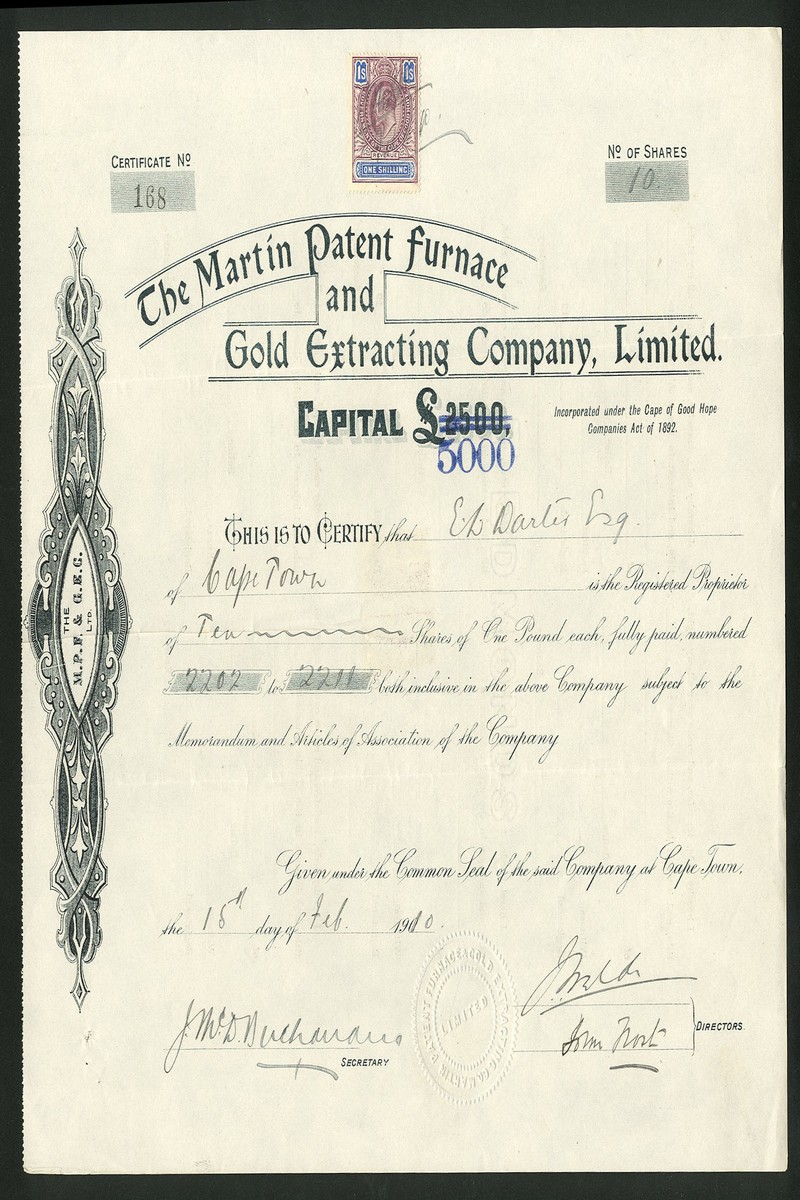 (x) A small group of South African finance and smelting companies comprising Westralian, London & Johannesburg Co. Ltd., £1 shares, 18[96], no.231, blue; Gold Finance Co. Ltd., 7/6d shares, 190[910], no.2659; Rand Ore Reduction Co. Ltd., £1 shares, 189[6], no.1945; Martin Patent Furnace and Gold extracting Co. Ltd., £1 shares, 190[910], no.168, and Electro-Chemical Gold & Silver Extracting Company (Julian's Patent) Ltd., £1 shares, 188[9], no.280, the last discoloured at left, otherwise about very fine. (5)