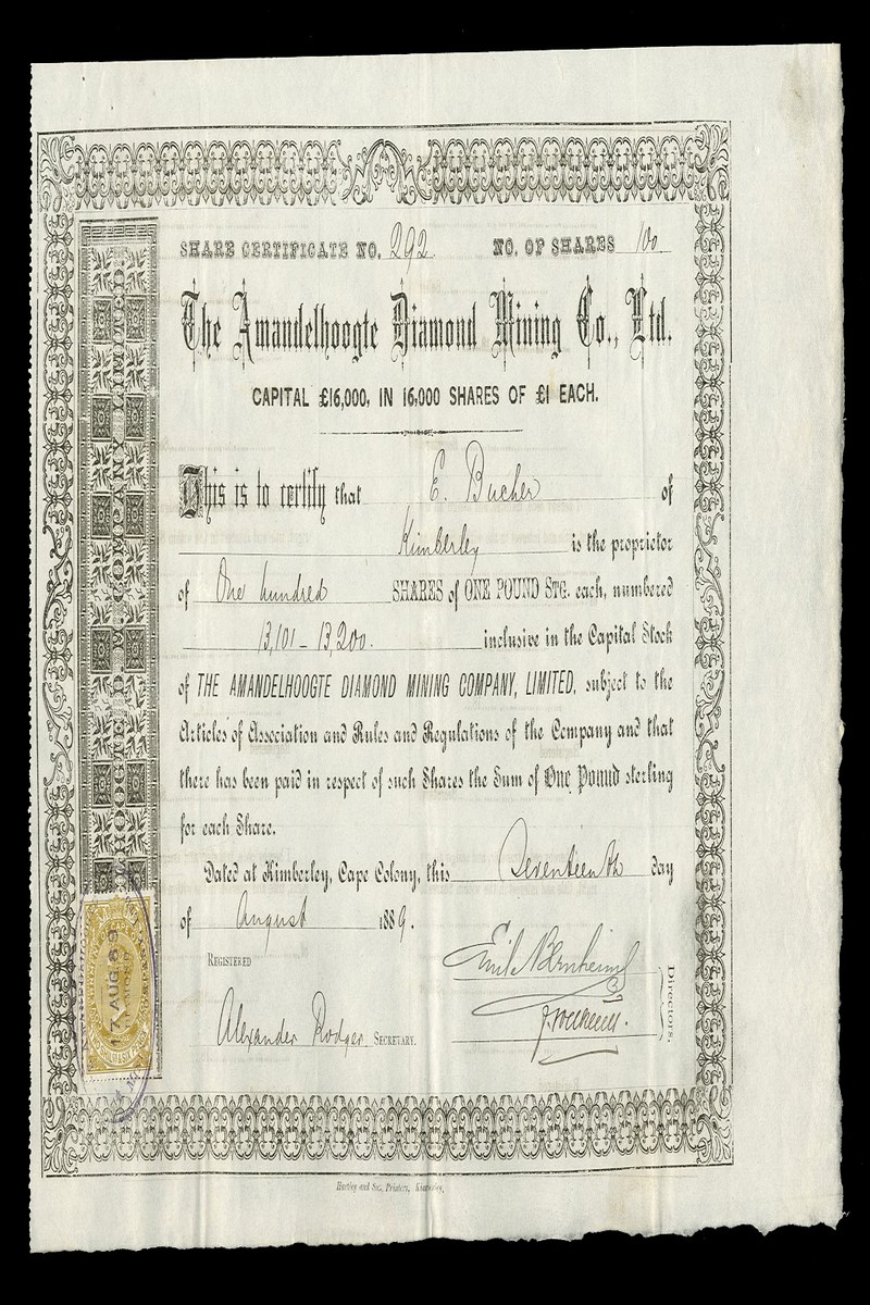 (x) Amandelhoogte Diamond Mining Company Ltd., £1 shares, Kimberley 188[9], black with revenue stamp, very fine