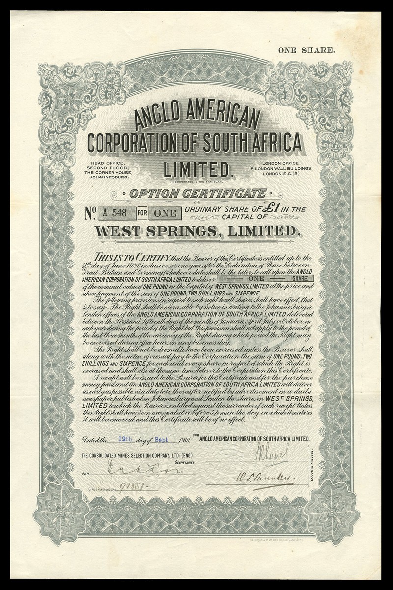(x) De Beers Consolidated Mines Ltd., share warrant to bearer for 1 Preference share, London 19[36], ornate border, green, together with Consolidated Diamond Mines of South West Africa Ltd., share warrant for 25 shares, London 19[30], orange; Frank Smith Diamond Estates & Exploration Co. Ltd., share warrant for 10 shares [1901], brown heavily creased, Elands Drift Diamond Estates Ltd., share warrant for 1 share of £1 [1902], pink and share warrant for 25 shares of £1 [1901] soiled with ink stains, green, and Anglo American Corporation of South Africa Ltd., option certificate for one share of £1, 1918, decorative border, grey, good unless stated (6)