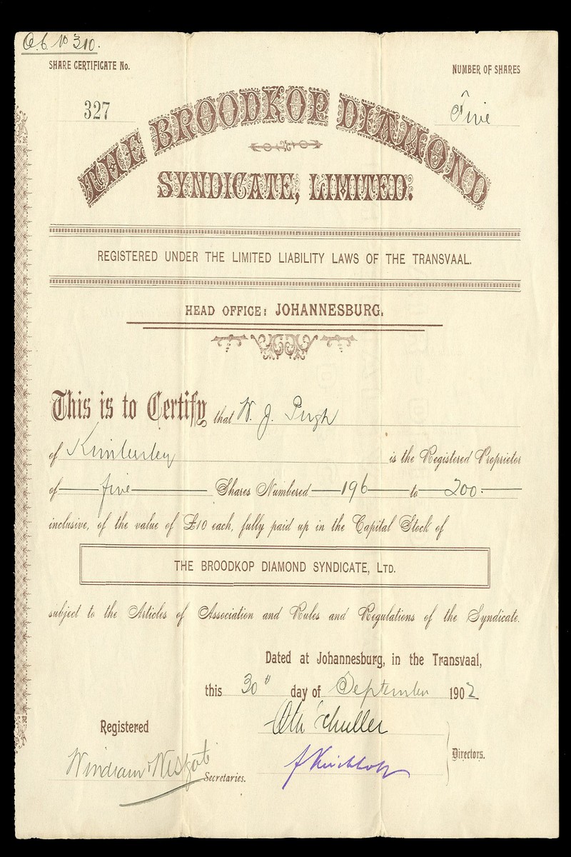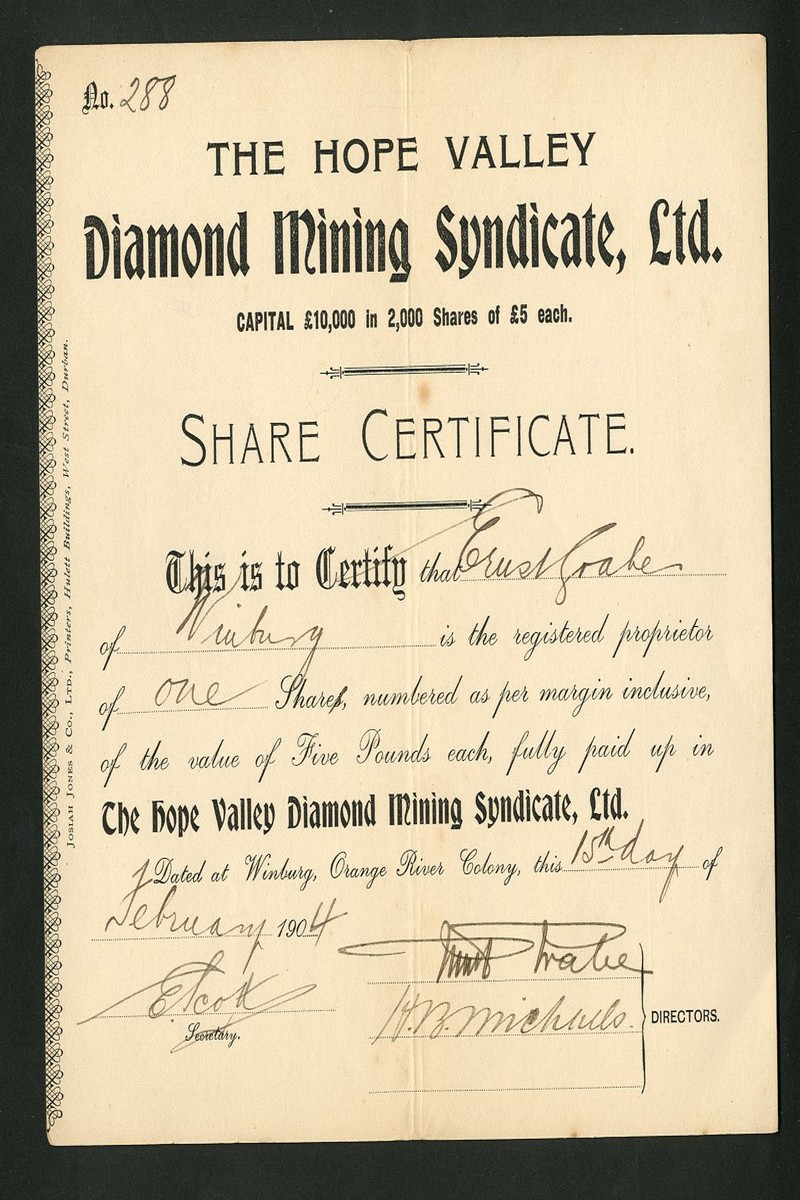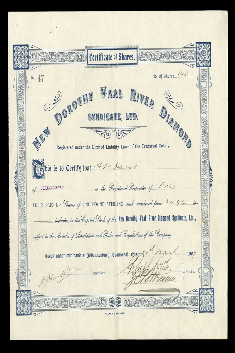 (x) Hope Valley Diamond Mining Syndicate Ltd., certificate for £5 shares, Winburg 190[4], black, together with Broodkop Diamond Syndicate Ltd., £10 shares, Johannesburg 190[2], brown and New Dorothy Vaal River Diamond Syndicate Ltd., £1 shares, Johannesburg 190[7], blue, very fine or better (3)
