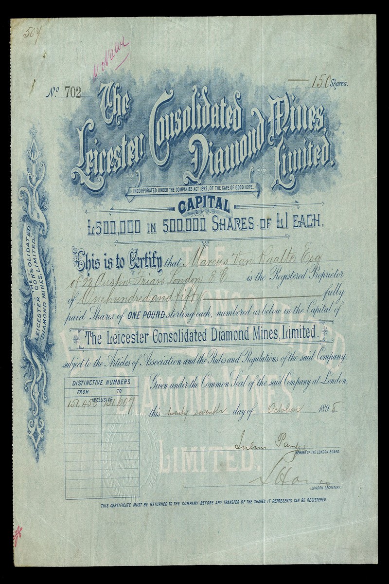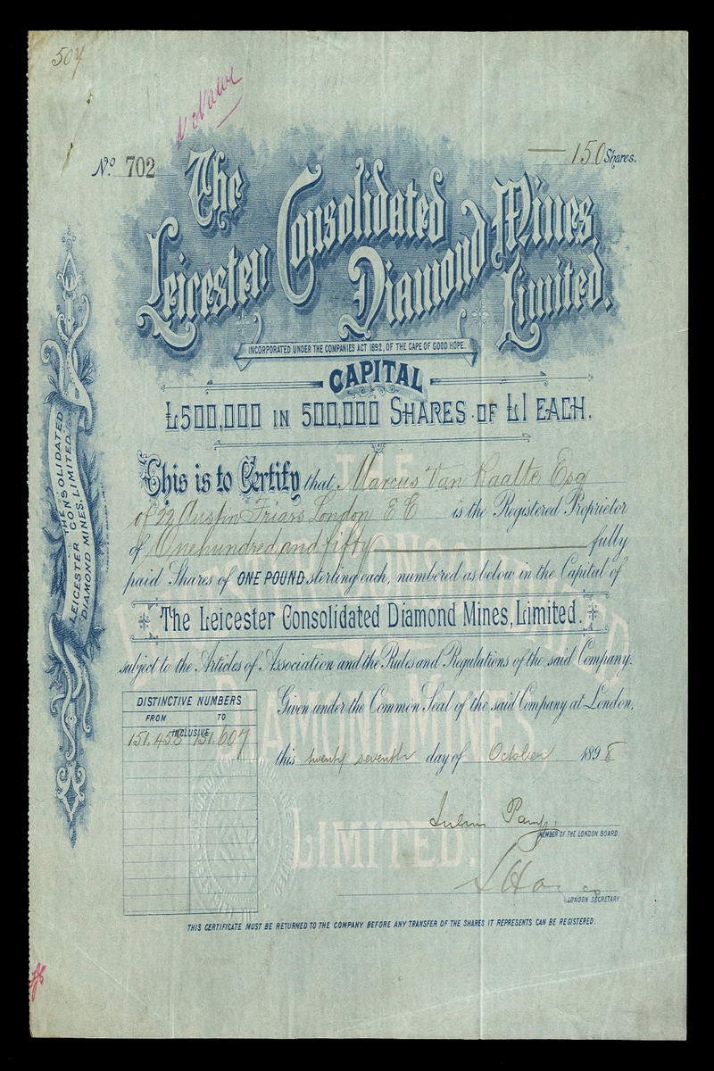 (x) Leicester Consolidated Diamond Mines Ltd., a pair of certificates for £1 shares, London 18[96], black and 189[8], blue, both very fine. (2)