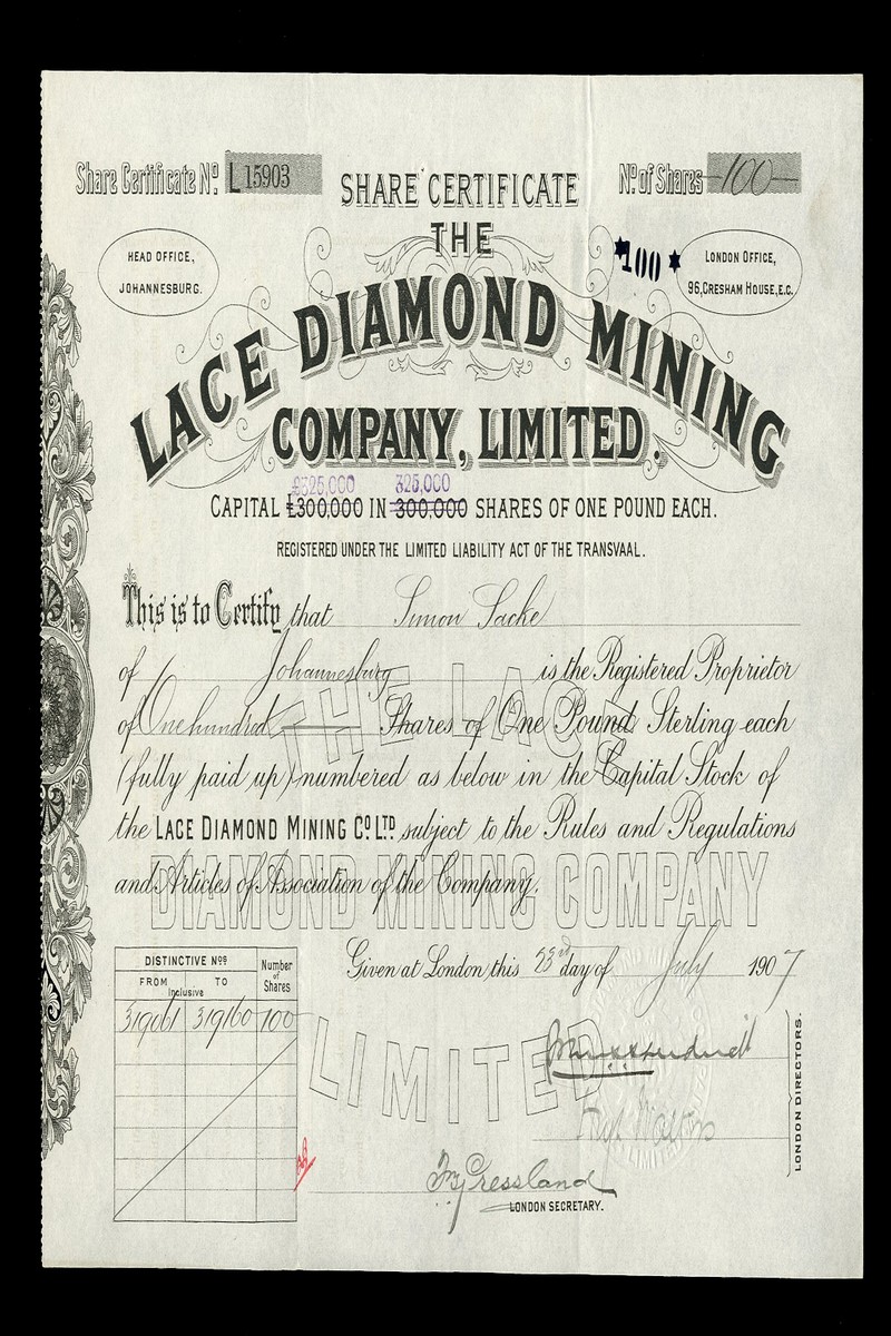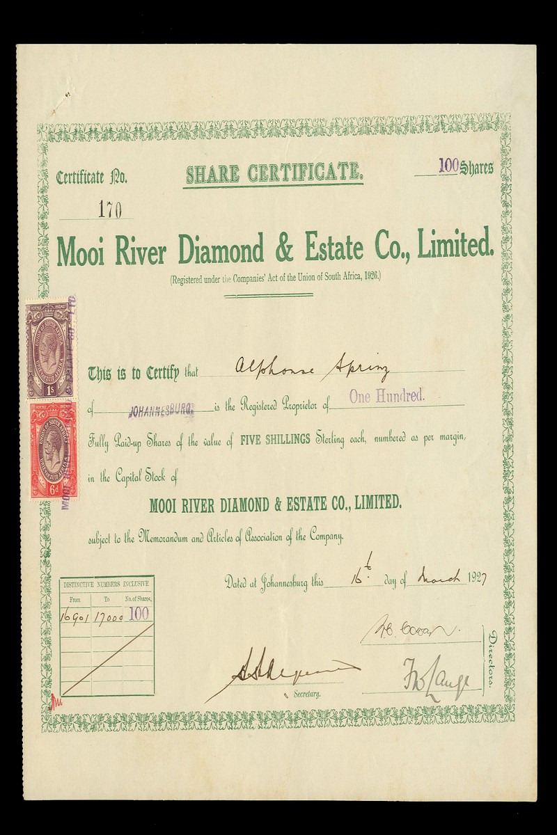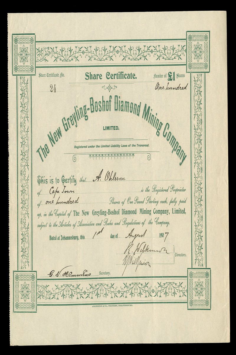 (x) New Greyling-Boshof Diamond Mining Company Ltd., certificate for £1 shares, Johannesburg 190[7], green, together with Mooi River Diamond & Estate Co., Ltd., 5 shilling shares, Johannesburg 192[7] green; Lace Diamond Mining Co. Ltd., £1 shares, London 190[7], and Richmond Diamonds Ltd., £5 shares, Johannesburg 190[7], brown, generally good very fine. (4)