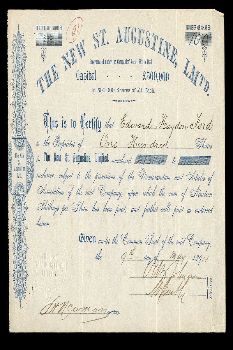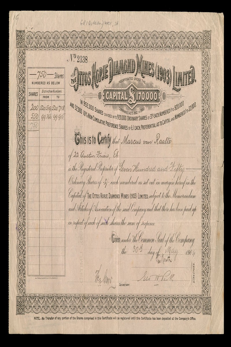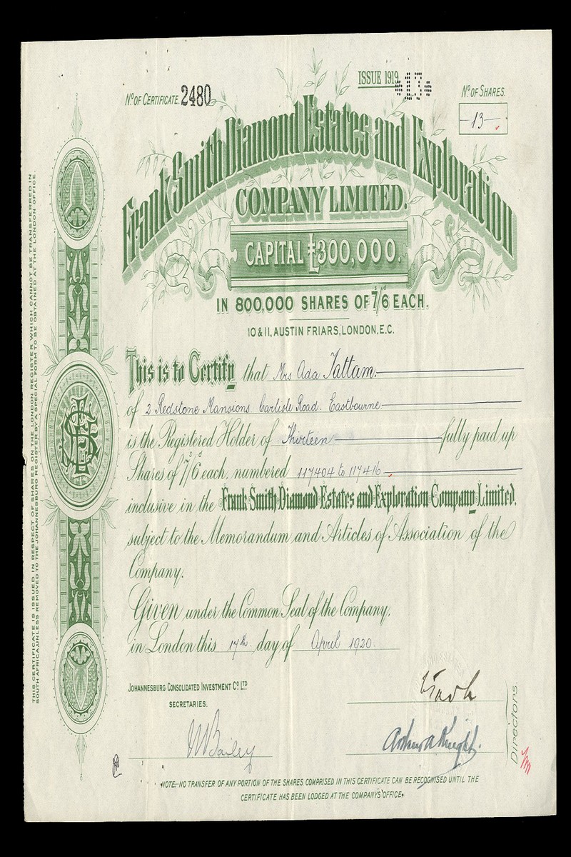 (x) Ottos Kopje Diamond Mines Ltd., £1 shares, 189[3], blue, together with Crown Diamond Mining and Exploration Company Ltd., 19[29] small tear top left, green, Frank Smith Diamond Estates Exploration Co. Ltd., share certificate, London [1920], green; New St Augustine Ltd., £1 shares, 189[4] and Ottos Kopje Diamond Mines (1903) Ltd., 190[4], generally very fine unless stated (5)