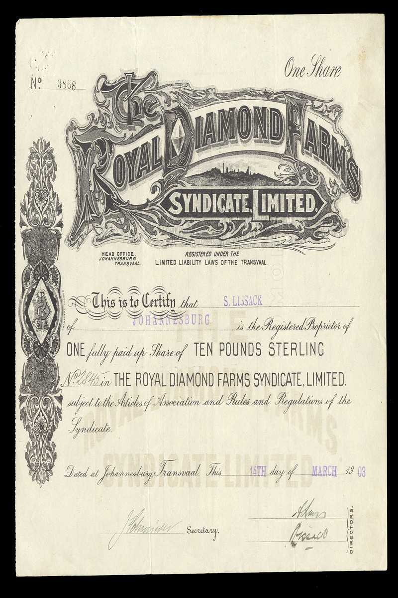 (x) Royal Diamond Farms Syndicate Ltd., £10 share, Johannesburg 19[03], attractive piece with vignette of mining area under title, brown, very fine