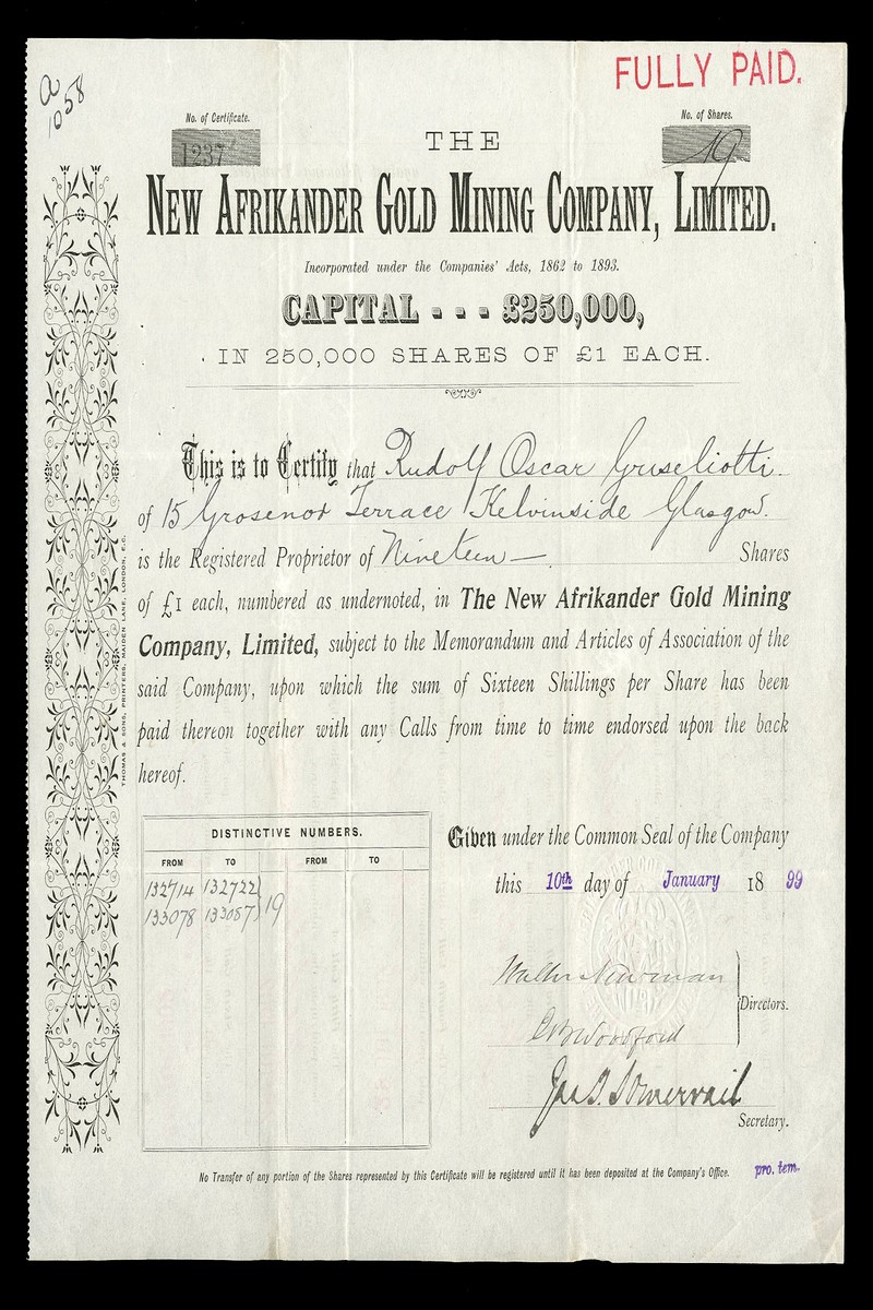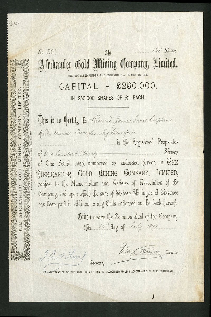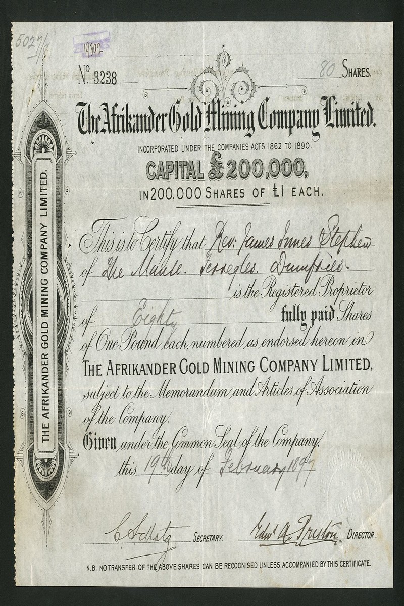 (x) Afrikander Gold Mining Company Ltd., £1 shares, fully paid, [1897], no.3238, black, and another also dated [1897], no.901, also black but of totally different style and showing a capital increase to £250,000, together with New Afrikander Gold Mining Co. Ltd., £1 shares, 18[99], no.1237, black, generally very fine. (3)