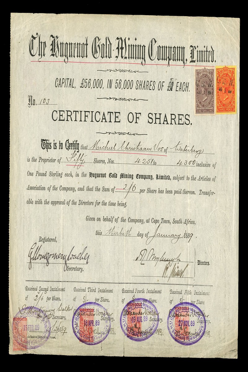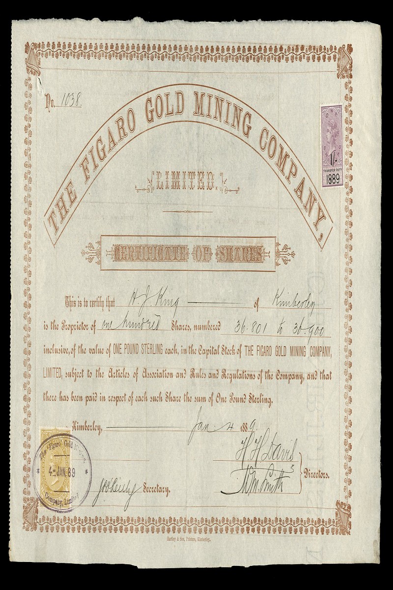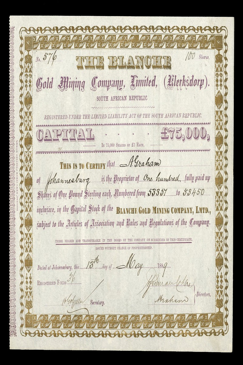 (x) Blanche Gold Mining Company Ltd., (Blerksdorp), £1 shares, Johannesburg 188[9], gold border with lilac text together with 2 other gold mining shares, Huguenot Gold Mining Company Ltd., Cape Town 188[9] and Figaro Gold Mining Company Ltd., £1 shares, Kimberley 188[9]; all with adhesive revenue stamps, generally very fine or better. (3)