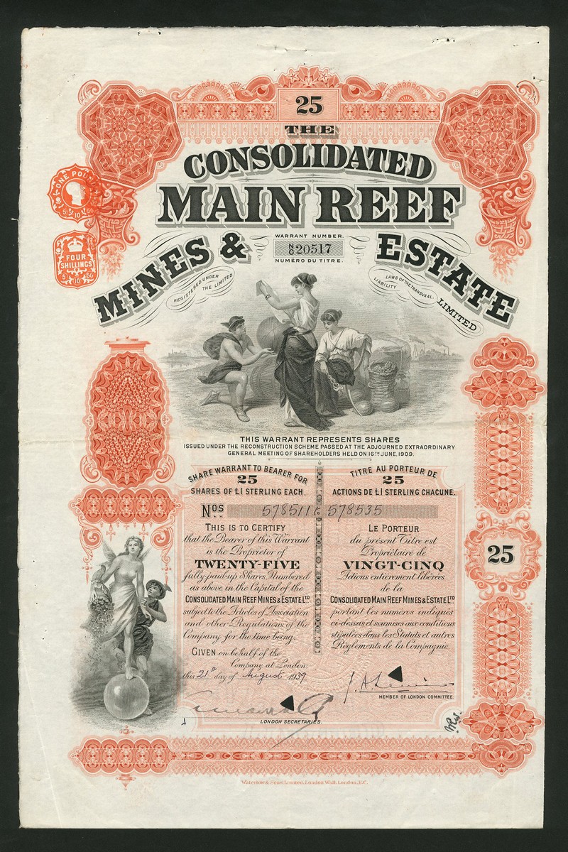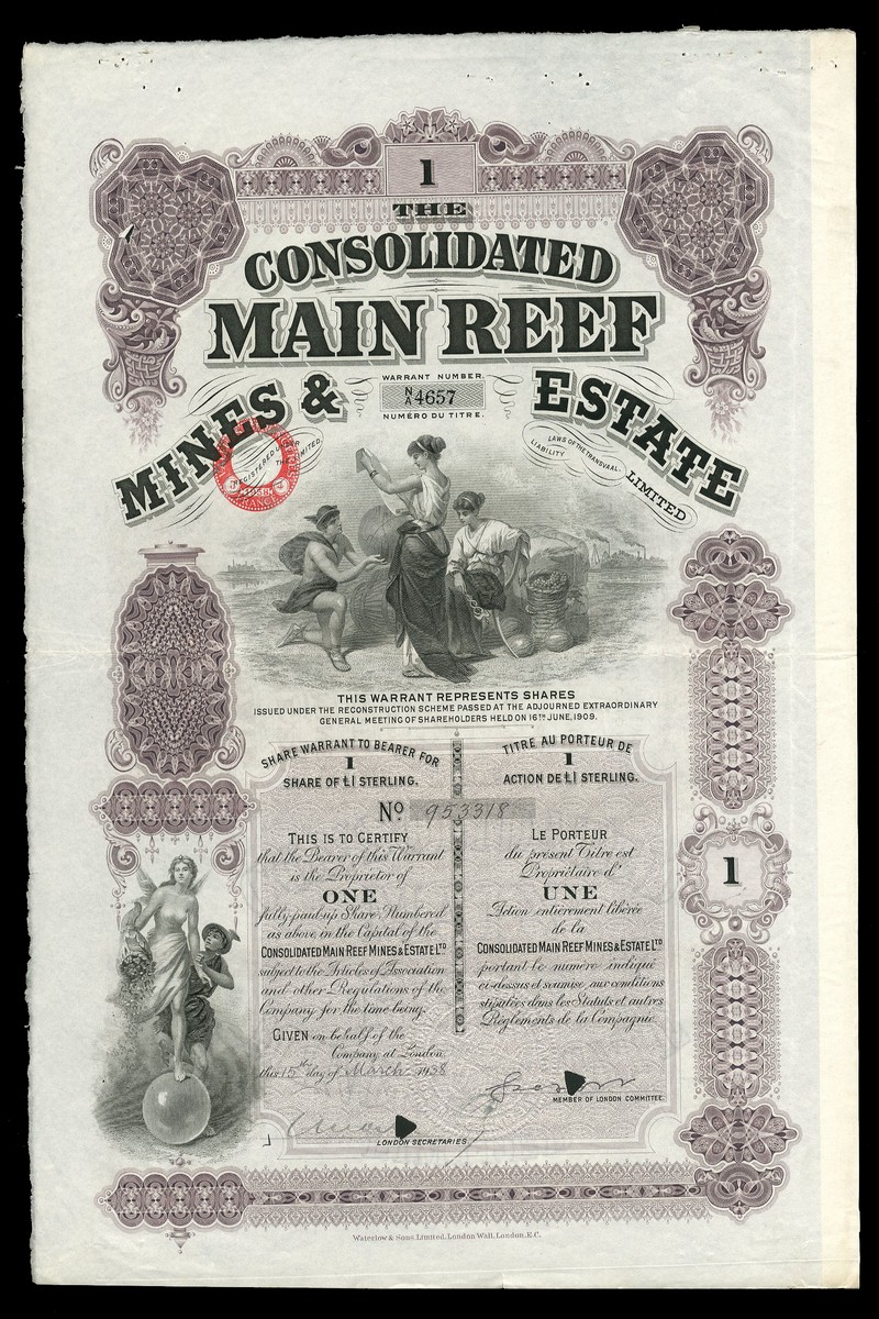 (x) Consolidated Main Reef Mines & Estate Ltd., group of bearer certicates for 1 (purple), 5 (blue) and 25 (red) shares, London 19[25]-19[38], allegorical figures, printed by Waterlow & Sons, hole cancelled, generally very fine (3)