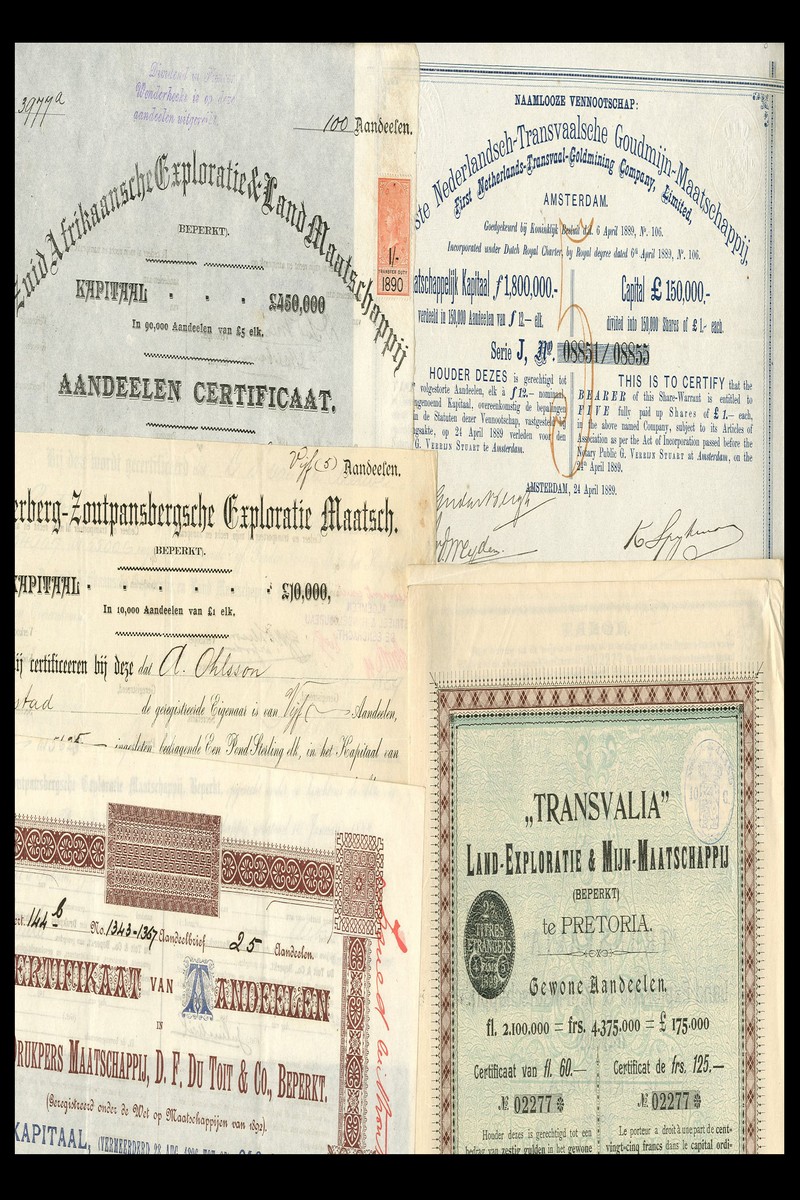 (x) De Drukpers Maatschappij, D.F. Du Toit & Co., certificate for £5 shares, Paarl 189[8], brown, together with 4 more dutch companies including De Waterberg-Zontpansbergsche Exploratie Maatsch, £1 shares, black, Pretoria 18[89]; De Zuis Afrikaansche Exploratie & Land Maatschappij, certificate for £5 shares, black, Pretoria 18[89]; and 2 further certicates registered in Amsterdam 1897 and 1889, very fine or better. (5)